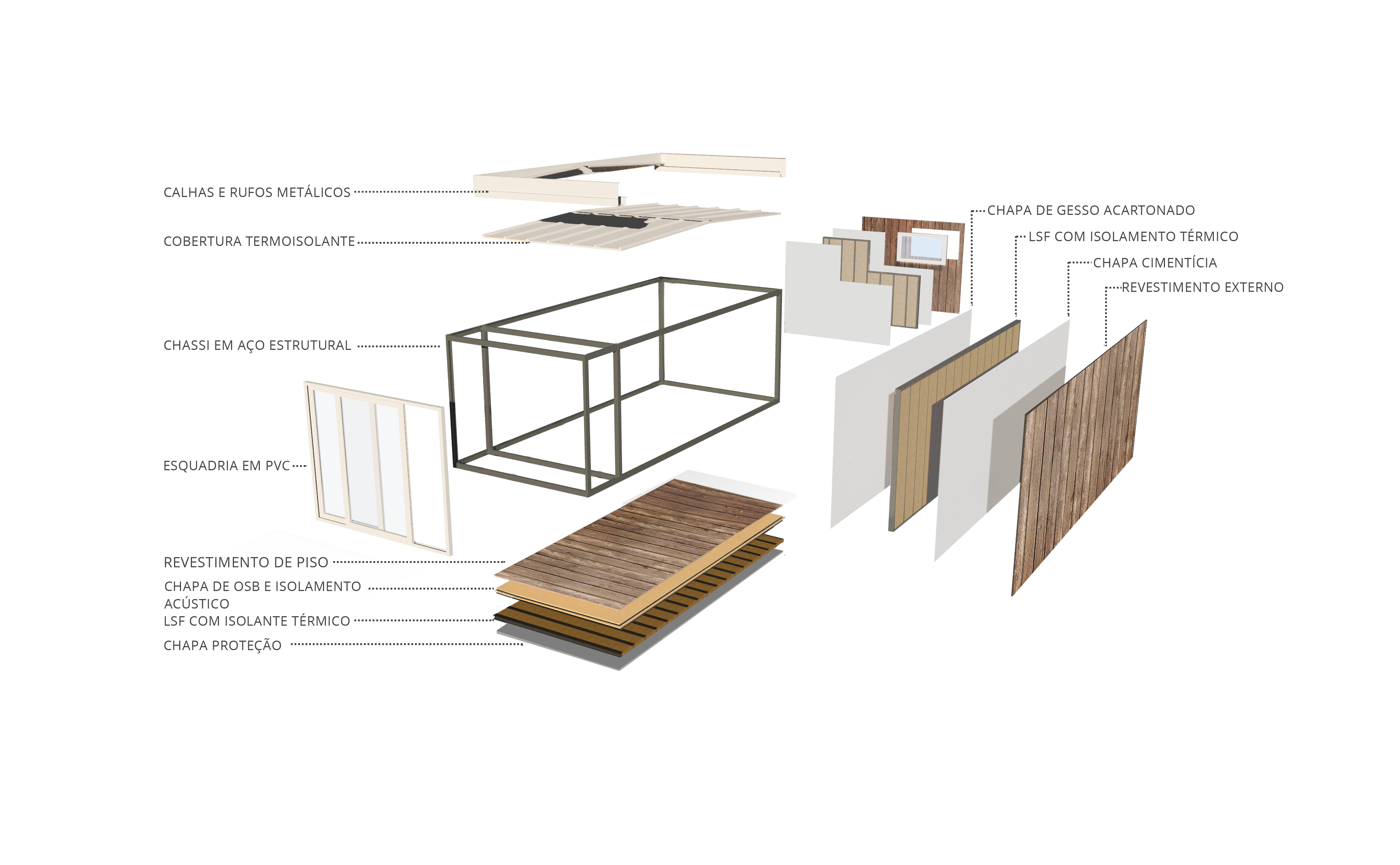 O uso do chassi de perfis de aço com dimensões modulares proporciona versatilidade estrutural e maior liberdade arquitetônica. Eles podem ser justapostos, posicionados em balanço, apoiados em fundações pontuais e ainda facilitam o transporte, montagem e desmontagem quando necessário.